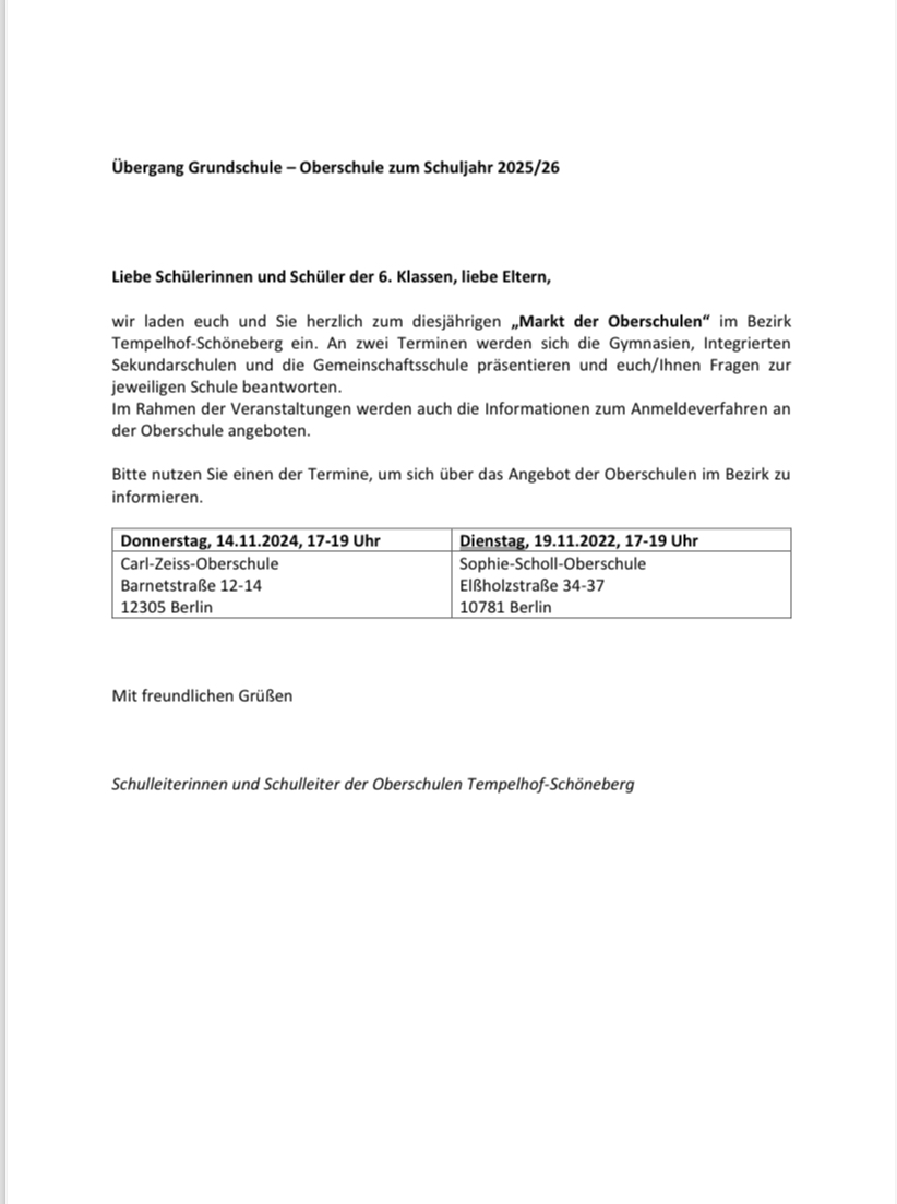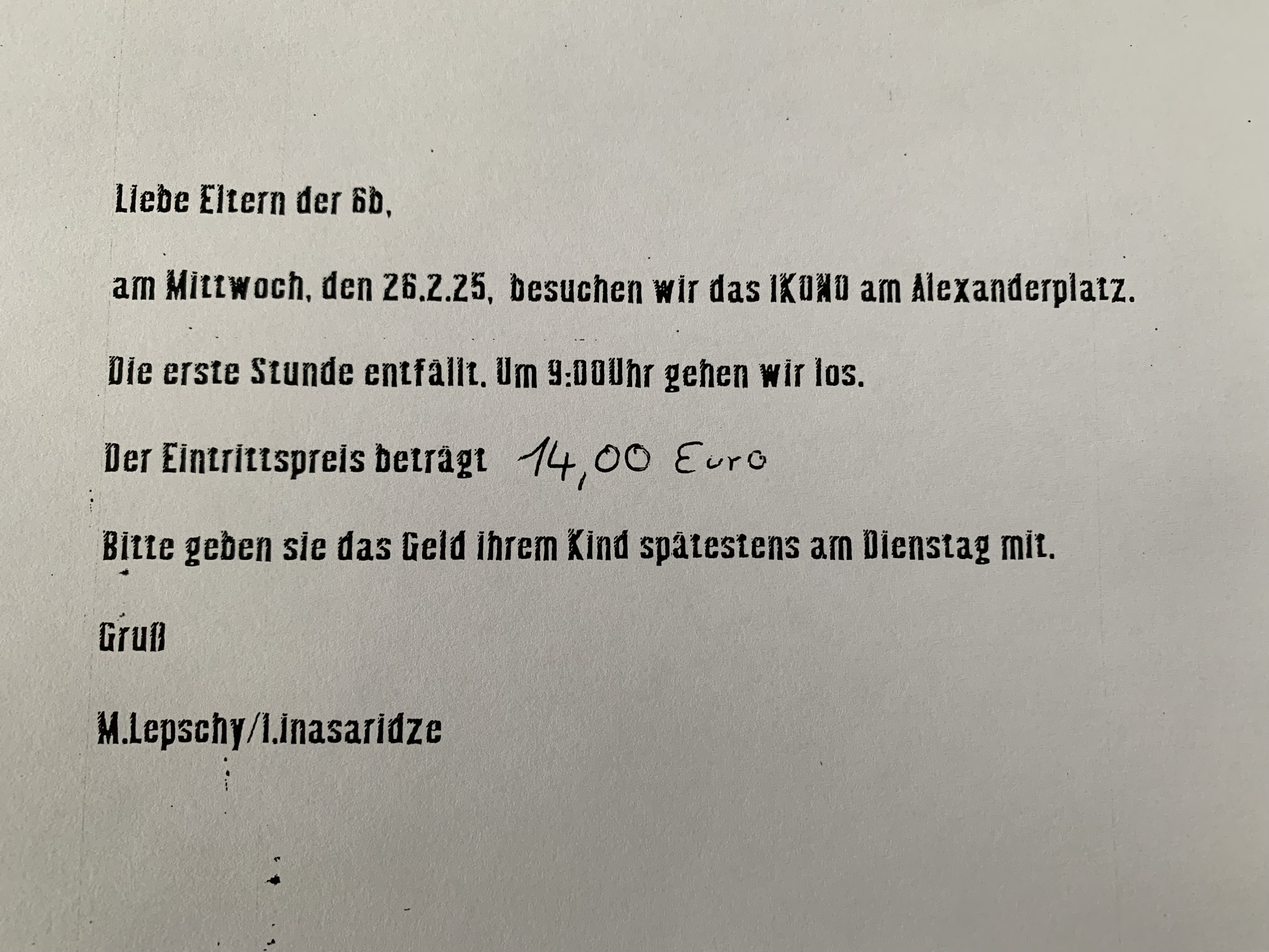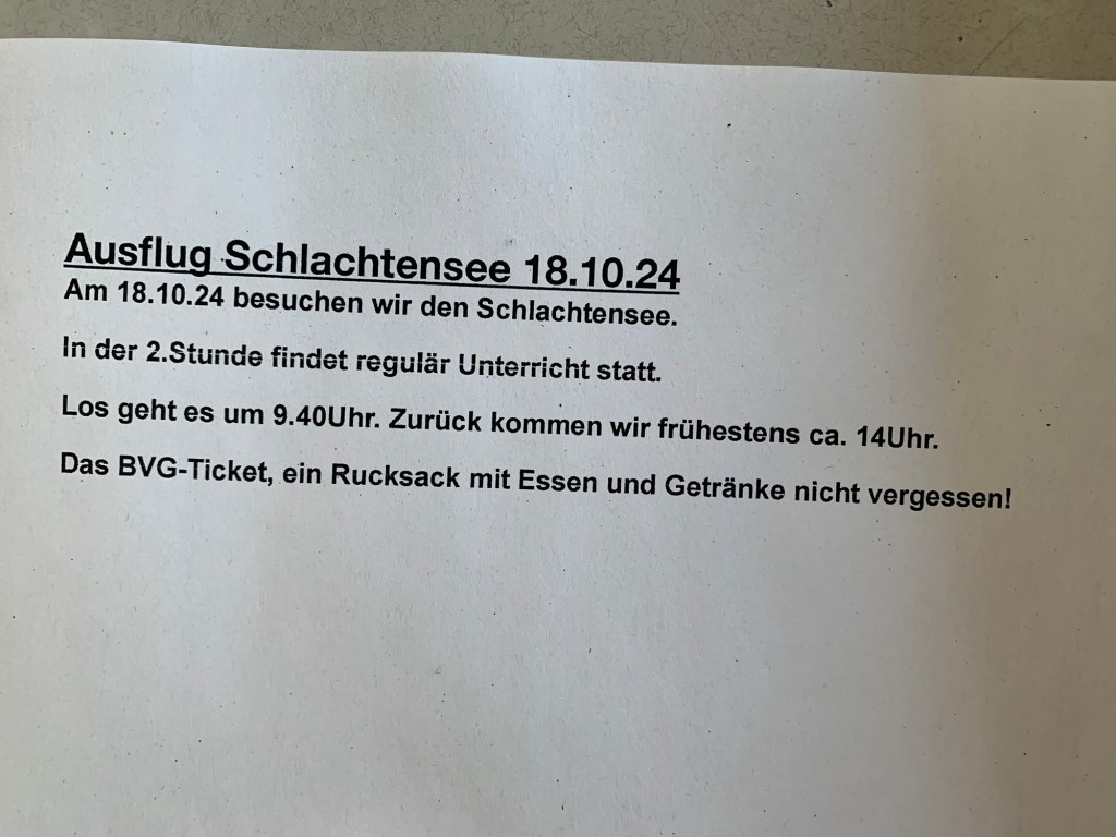 Um 9.00Uhr treffen wir uns an der Schule. 14.00Uhr sind wir wieder zurück.